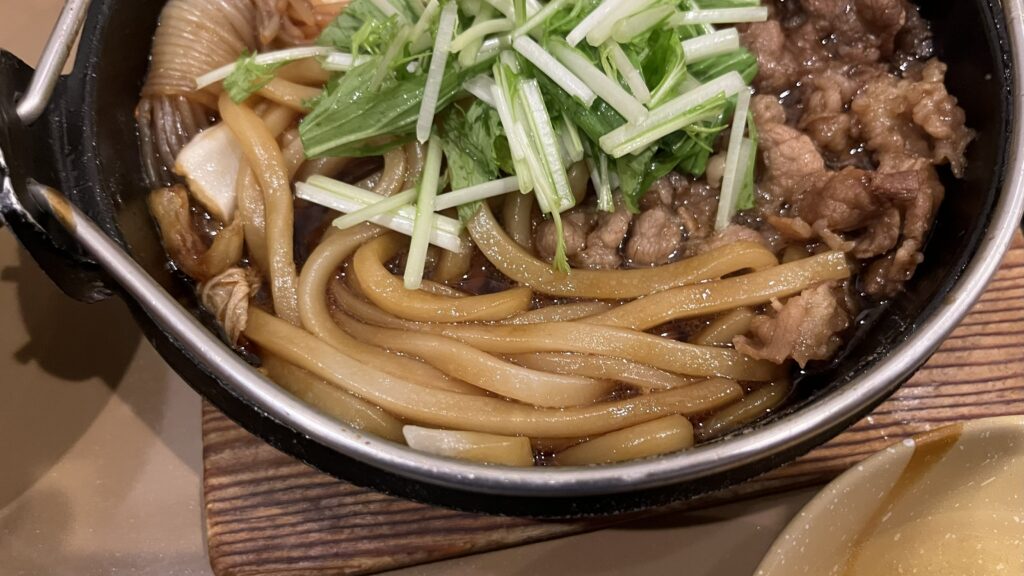 量もボリュームがあり、うどん好きな方にも満足していただける内容だと思います。熱々の状態で提供され、すき焼きのたれと絡み合う味わいは格別でした。